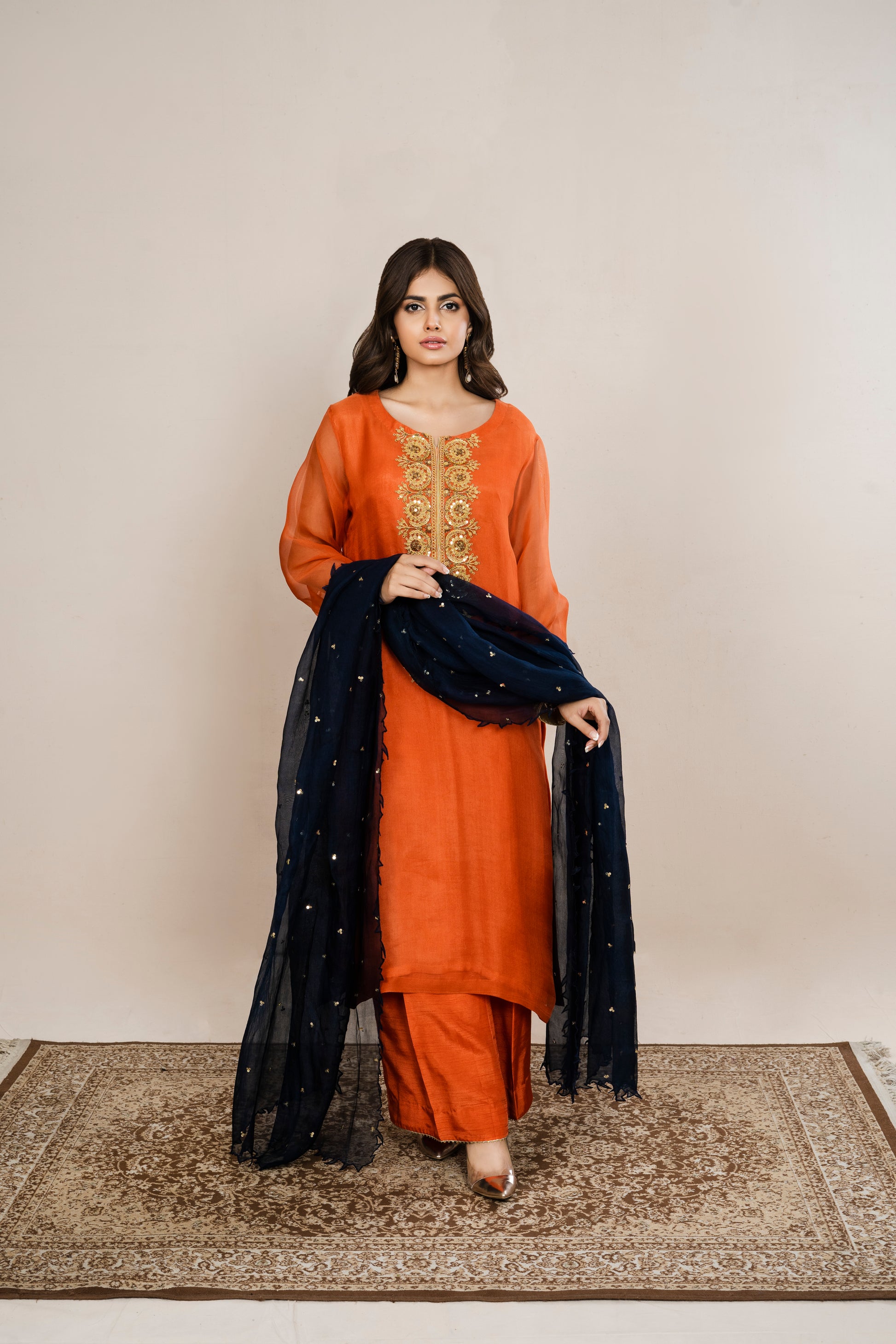 A-line shirt with exquisite handmade marrori work, beautifully highlighted with delicate sequins on the neckline and sleeves. It's elegantly paired with a contrasting navy blue dupatta adorned with a captivating sitara spray, finished with intricate scallops on the edging, ensuring a captivating and unique look.