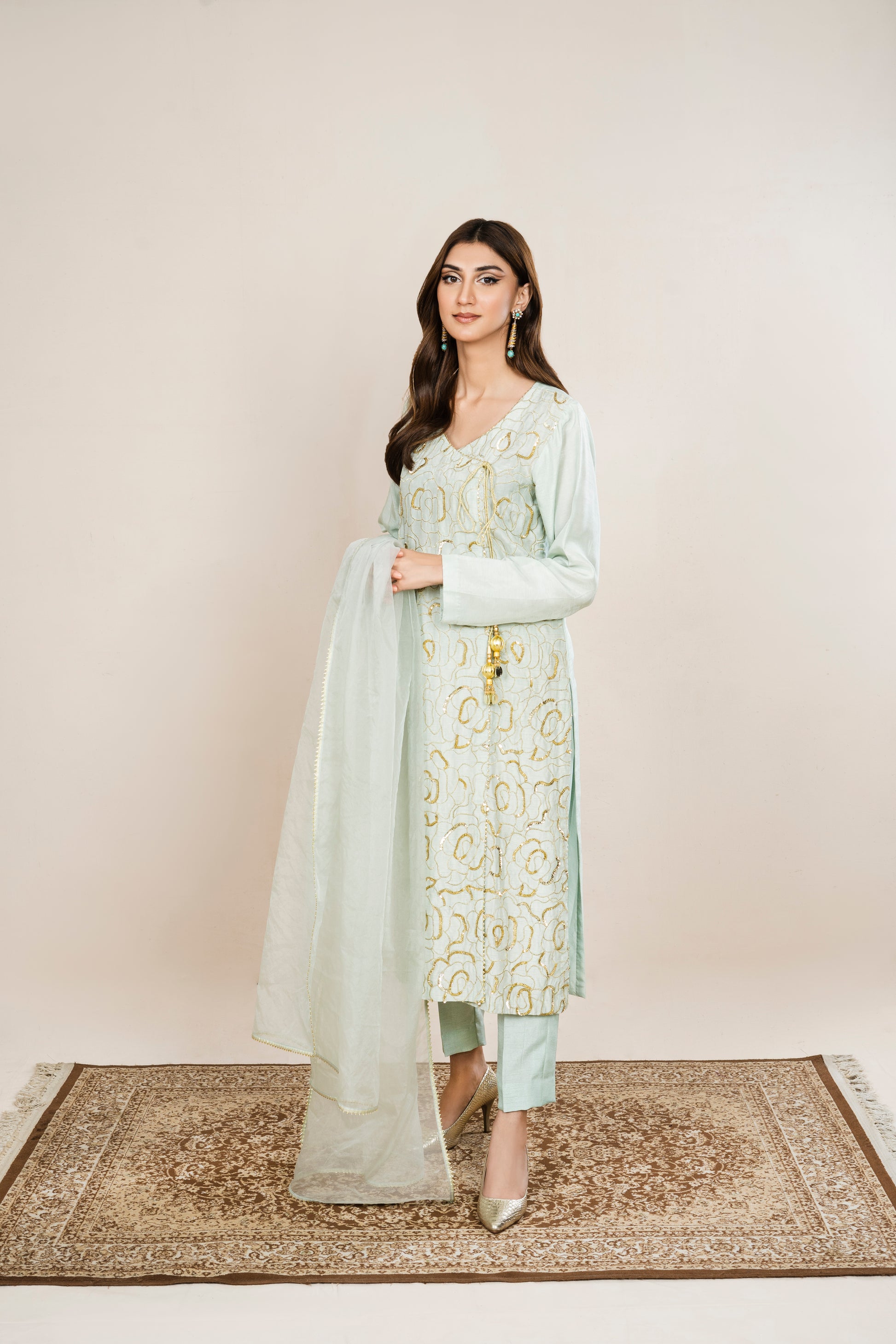 This captivating dress features an Angrakha-style shirt adorned with intricate golden tilla and sequin work, radiating opulence. The shirt is adorned with a regal touch of golden kingri lace, and the front is accentuated by a charming tassel dori. Paired with this masterpiece is a delicate organza dupatta that adds an ethereal dimension to the ensemble.
