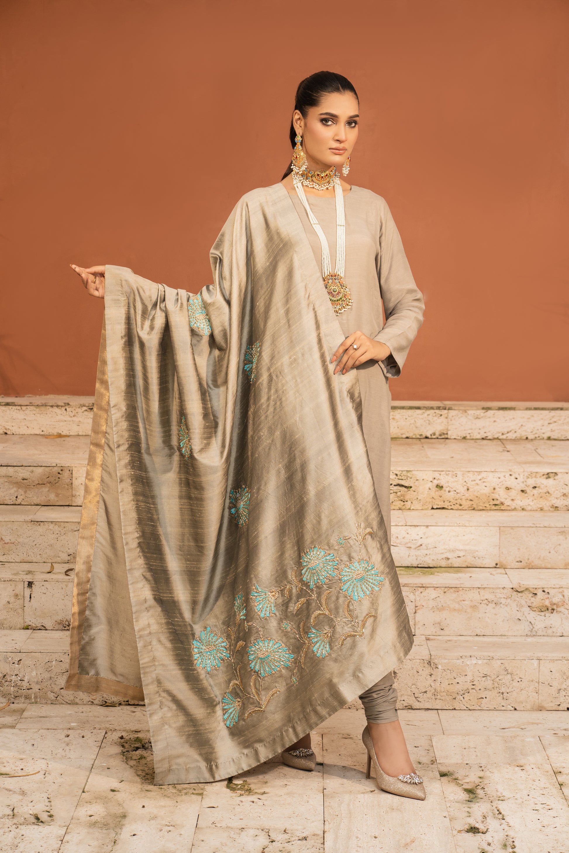 Elevate your style with this exquisite dress featuring a contrasting Feroze Thread embroidered shawl. The shawl is delicately embellished with shimmering golden cut dana, intricate sequins, and elegant beads. To add a touch of opulence, the ensemble is beautifully finished with a golden tissue border, making it the perfect choice for a truly stunning and distinctive look.