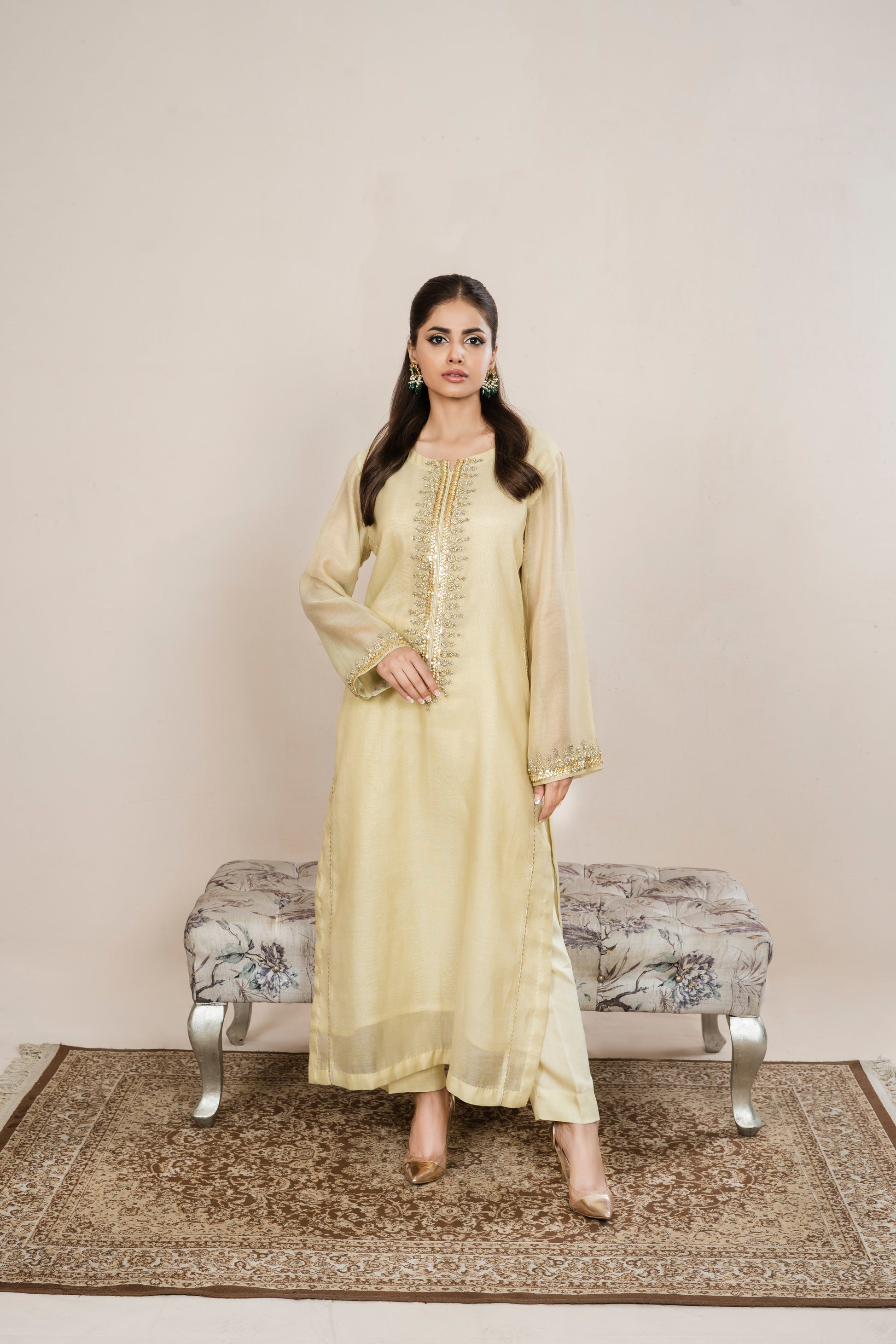 This A-line panelled shirt is a work of art, featuring exquisite embellishments. It's adorned with intricate gotta work, kora, dabka, lustrous pearls, and delicate sequin work, making it a true statement piece of fashion. Paired with premium rawsilk trousers and a chiffon duppatta with golden lace finishing.