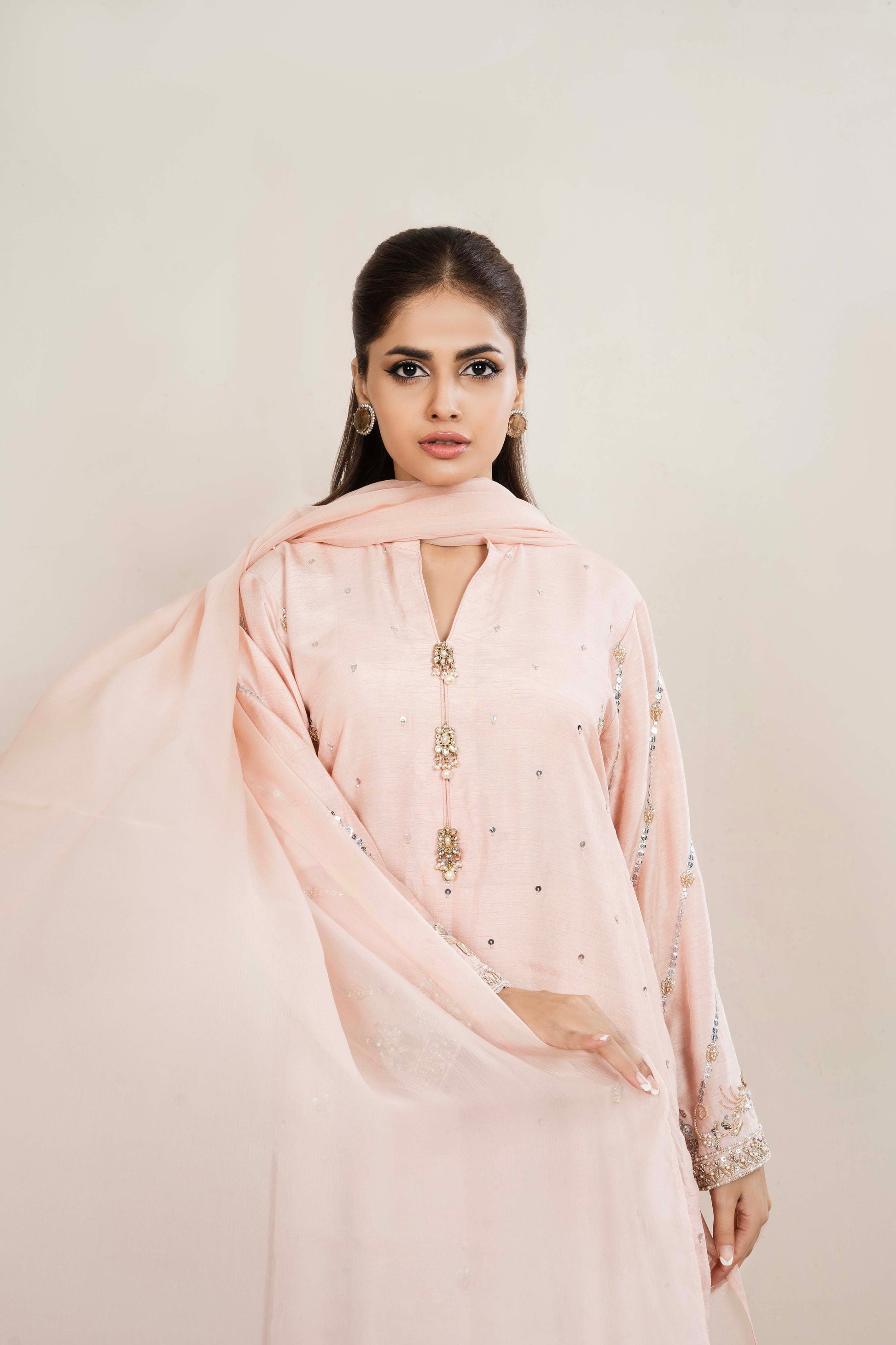 The opulent heavy embellishments on the sleeves and a captivating spray pattern on the shirt, featuring kora, dabka, pearls, cut dana, and delicate sequins. The neckline is adorned with exquisite kundan buttons, adding a touch of regal charm to this dazzling ensemble. Paired with a Korean Rawsilk trousers and a Chiffon Duppatta.