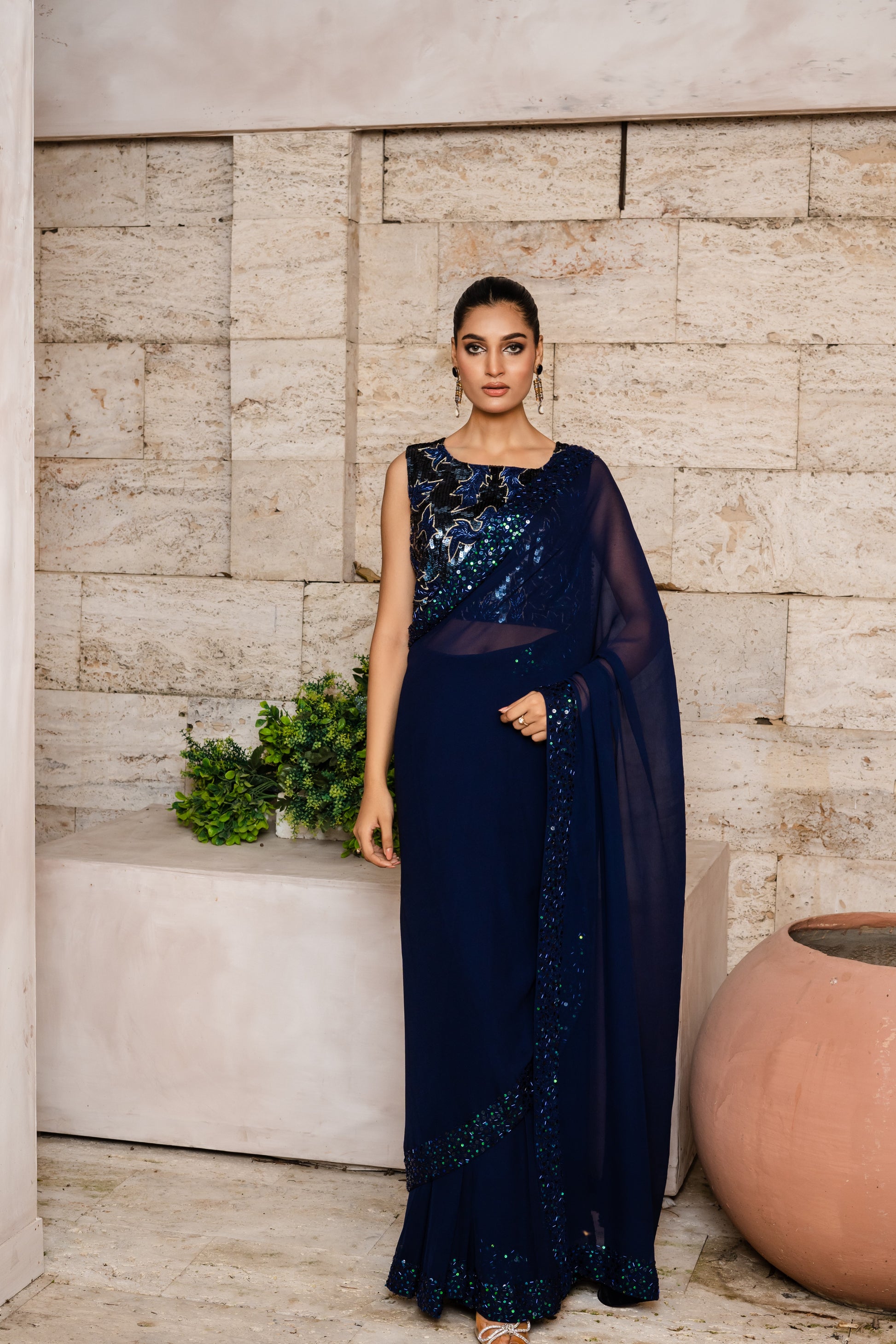 This outfit offers a touch of glamour with a rawsilk blouse featuring two-toned sequins and cut dana work, along with exquisite gold tilla aari embroidery. The saree is elegantly adorned with a scattered material spray border, creating a graceful and stylish ensemble.